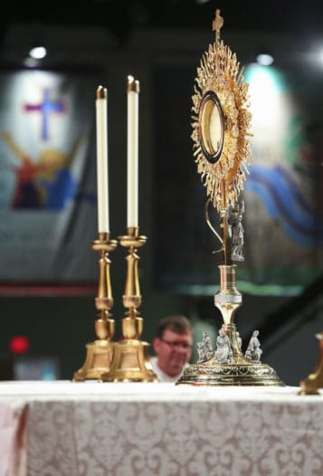 The monstrance, holding the real presence of Jesus, is displayed on the altar during exposition and adoration at the 2018 Eucharistic Congress in Atlanta. The congress returns in 2022. The U.S. bishops will discuss eucharistic renewal at their fall meeting this month. Photo by Michael Alexander