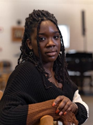 Newman Scholar of the Year and artist, Betoyah Dorzema, has a ceramic sculpture featured in a new exhibit at Lyke House Catholic Center. She is photographed inside the Lyke House Chapel. Photo by Johnathon Kelso