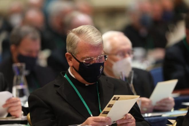 Atlanta Archbishop Gregory J. Hartmayer, OFM Conv., wearing a protective mask, prays Nov. 16 during a session of the fall general assembly of the U.S. Conference of Catholic Bishops in Baltimore. Due to the COVID-19 pandemic, it is the first in-person bishops’ meeting since 2019. CNS photo/Bob Roller