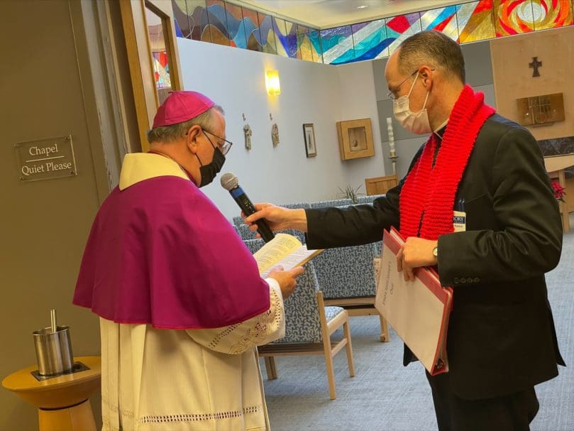 Bishop Joel M. Konzen, SM, alongside Father Patrick Scully, the hospital chaplain, blessed the updated chapel and participated in the tree lighting on Dec. 3.