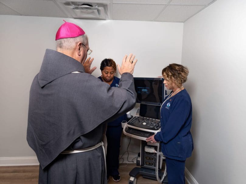 Archbishop Gregory J. Hartmayer, OFM Conv., blesses staff members and the new ultrasound machine at at the Pregnancy Aid Clinic in downtown Atlanta. It is the program’s third clinic location. Photo by Johnathon Kelso