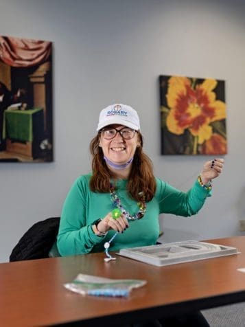 Seated at a small table, Gloria Sowers, along with her mother, Sharon, works with beads. In the future, someone will use Gloria’s creation to count the traditional Marian prayers that make up the rosary. Gloria, 33, who has been diagnosed with autism, has a love for beading at home. That makes the Rosary Makers of America office a favorite place.
