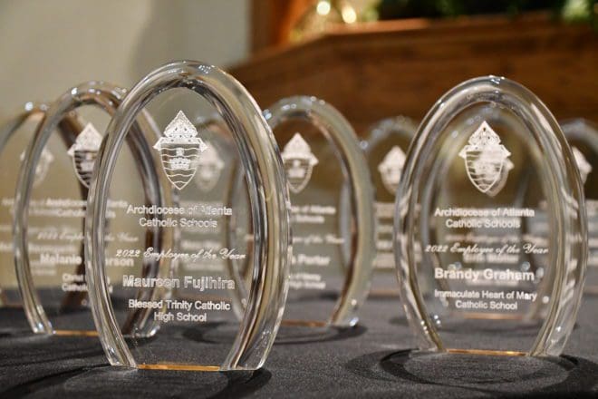 The Catholic Schools Week employees of the year awards on display prior to the Jan. 29 Mass in Kennesaw. Photo by Jackie Holcombe