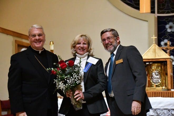 Principal of the Year Cathy Lancaster of Blessed Trinity High School, Roswell, is congratulated by Archbishop Gregory J. Hartmayer, OFM Conv., left, and Hal Plummer, superintendent of schools, right. The archbishop celebrated Mass for the honorees at St. Catherine of Siena Church, Kennesaw, on Jan. 29. Photo by Jackie Holcombe