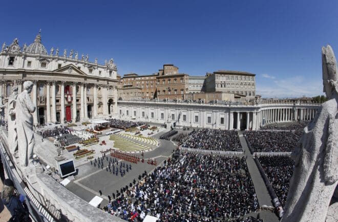 As Mass progressed, tens of thousands more began lining the streets outside the square. The Vatican said police estimated 100,000 people had gathered for the post-Mass blessing.