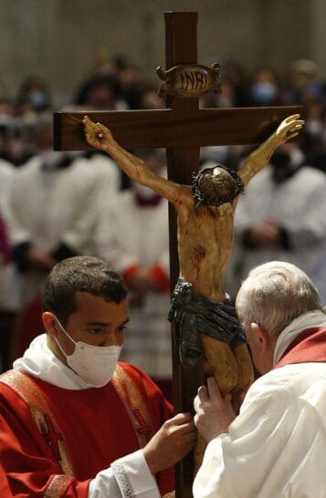 During the veneration of the cross, after the homily, the pope wore a red chasuble and prayed in silence before kissing the cross and then holding it aloft for veneration. Because of safety measures in place to limit the spread of the virus that causes COVID-19, the cross was then placed before the main altar for veneration from the pews, without people processing before the cross to genuflect and kiss Christ’s feet.