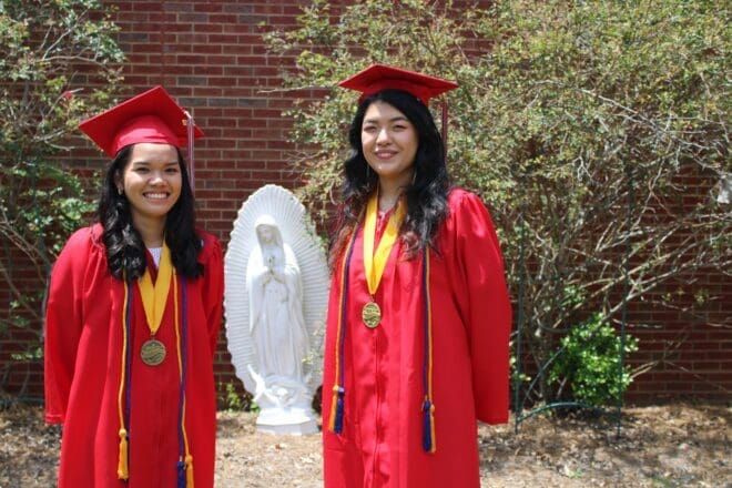 The last valedictorian and salutatorian for Our Lady of Mercy High School in Fayetteville are Cindy Cao, left, and Amy Nguyen, right. The school will consolidate with Our Lady of Victory in the fall. Photo Courtesy of Our Lady of Mercy High School