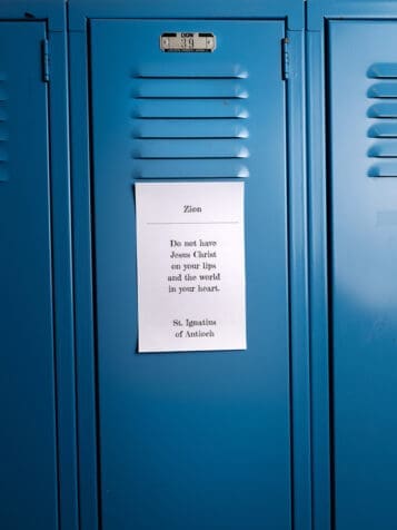 A quote from St. Ignatius of Antioch is posted on a student’s locker at Our Lady of Victory school in Tyrone. Photo by Johnathon Kelso