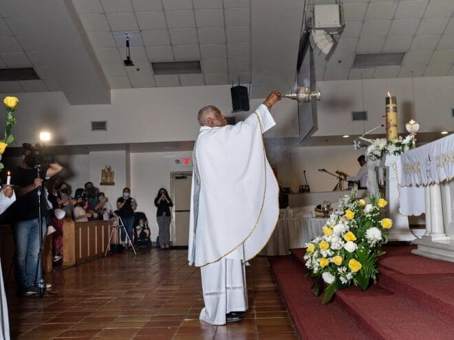 Bishop-designate Jacques E. Fabre-Jeune, CS, censes the altar during a farewell Mass at San Felipe de Jesús Mission. He is now the 14th Bishop of Charleston. Photo by Johnathon Kelso