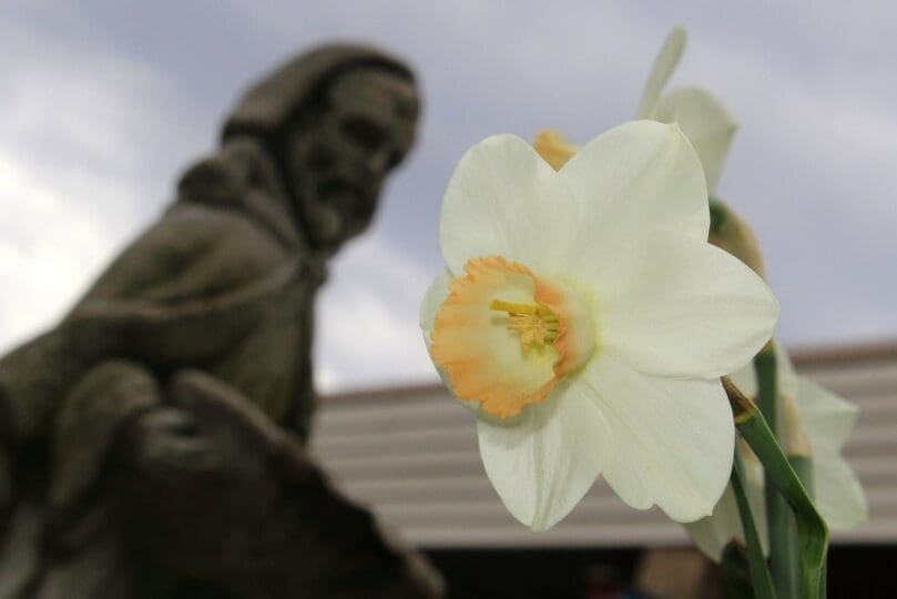 Then, I make my way to another corner of the yard to where my St. Francis bird feeder is located. St. Francis’ outstretched hand holds a dish from which the birds can gain nourishment. Around the base, I place flowers that I hope will attract other living creatures, such as bees and butterflies.