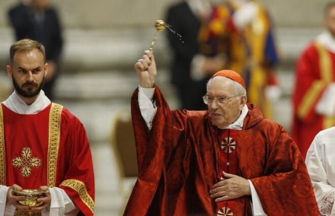 Cardinal Giovanni Battista Re uses holy water as he celebrates Mass attended by Pope Francis for the feast of Pentecost in St. Peter’s Basilica at the Vatican June 5. Cardinal Re has substituted as the main celebrant on a few occasions when the pope has had health problems. CNS Photo/Paul Haring