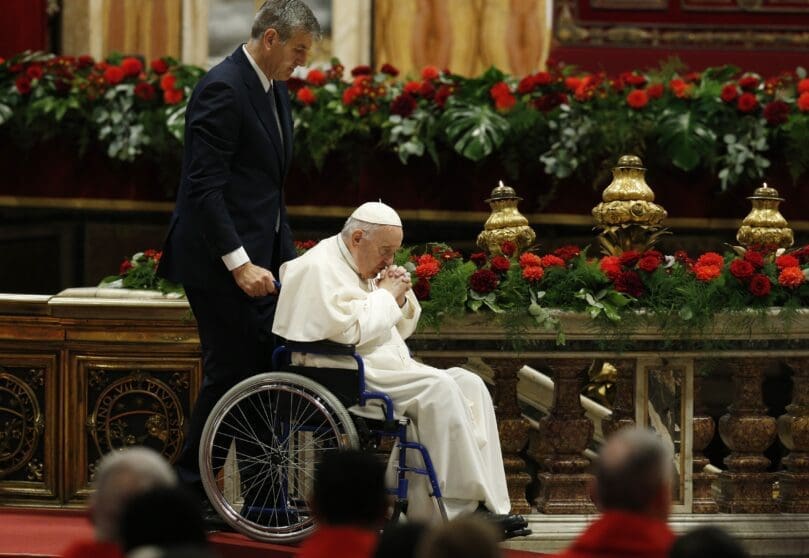 Cardinal Giovanni Battista Re, dean of the College of Cardinals, was the main celebrant at the Mass, and Pope Francis delivered his homily from a wheelchair on a platform in front of the altar. The pope has had ongoing difficulty walking and standing because of a knee problem. During the Mass, he sat in a chair facing the altar in the area normally reserved for dignitaries; the Vatican pushed news photographers further back than usual for the ceremony.