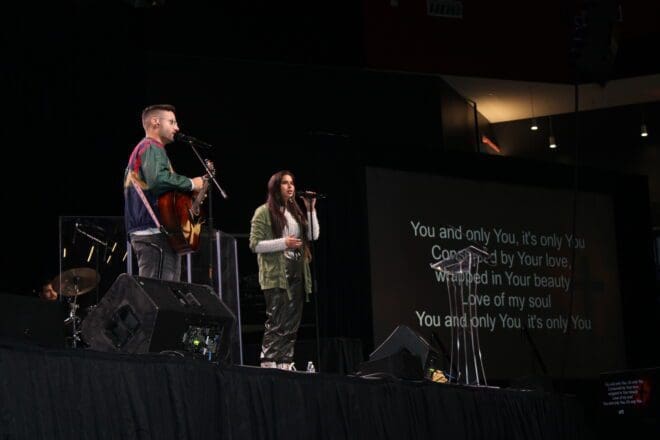Young adults gathered at the Gateway Center Arena for the Revive Track Friday, June 17. They worshipped, prayed and enjoyed fellowship with each other in an atmosphere reminiscent of a concert or sporting event. Outside of the main gathering area near the stage, participants could grab a drink, play cornhole or hit the putting green. EPIC the Band provided music before and after activities, and the track keynote speaker was Michael “Gormer” Gormley.