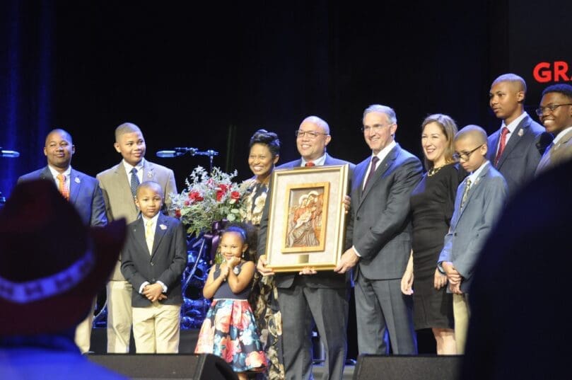 “Being raised as a Christian in the Catholic faith, we were always taught that a family that prays together, stays together and that always resonated with us,” Sewell said, before crediting his wife for being “the glue that has kept our family together.”