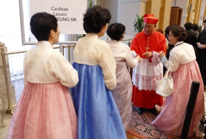 New South Korean Cardinal Lazarus You Heung-sik, prefect of the Dicastery for Clergy, greets guests at a reception after a consistory for the creation of 20 new cardinals at the Vatican Aug. 27. CNS photo/Paul Haring