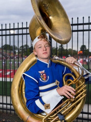 A Marist War Eagle marching band member is photographed before the halftime show during the matchup against Woodward Academy held on Sept. 9. Photo by Johnathon Kelso