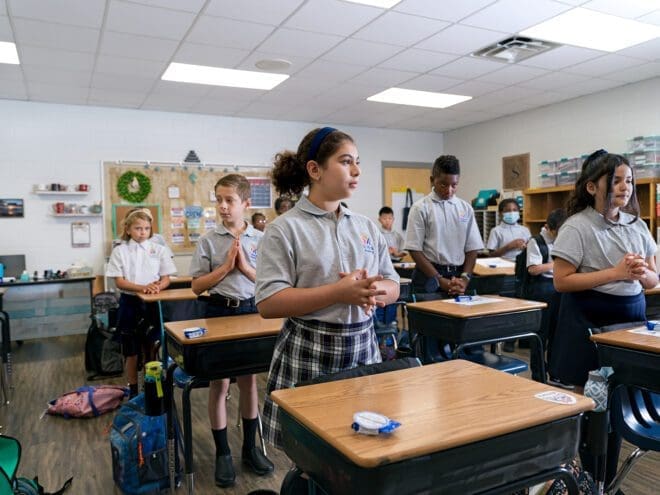 Students begin their morning prayer at St. Mary’s Academy in Fayetteville on Aug. 8. The academy is a consolidated school bringing together the communities of the former Our Lady of Victory School and Our Lady of Mercy High School. Photo by Johnathon Kelso