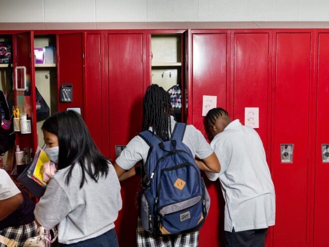 Students prepare their lockers in the halls of St. Mary’s Academy in Fayetteville. Photo by Johnathon Kelso