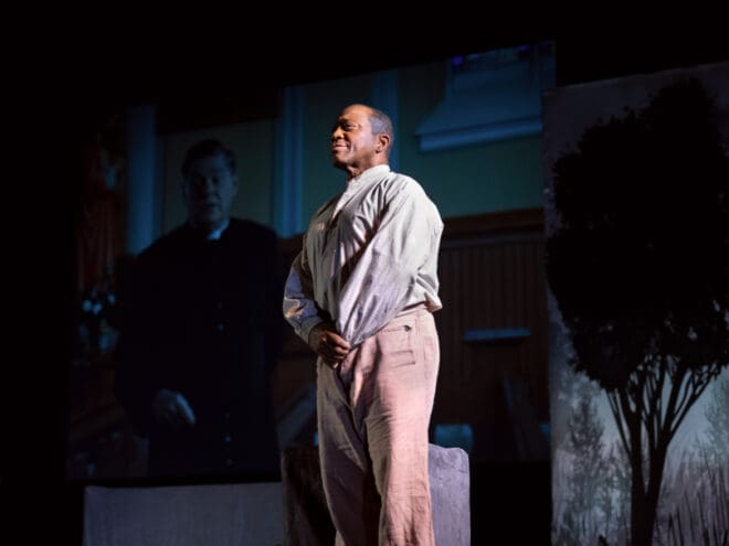 Other actors appear on the large screen while veteran actor Jim Coleman portrays Father Tolton. Among the characters are a racist German priest, a welcoming Italian prelate, the priest’s best friend, and Martha Jane, Tolton’s long-suffering mother. Throughout the show, Coleman responds to the characters shown on the screen.
