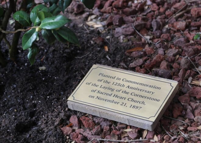 A commemorative plaque was placed to remember the tree planting at Atlanta’s only basilica. Photo by Mike Wazlavek