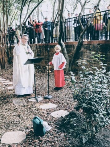 Father John Howren blesses a tree planted to mark the 125th anniversary of the laying of the cornerstone of the Basilica of the Sacred Heart of Jesus. A commemorative plaque was placed to remember the tree planting. Photo by Mike Wazlavek