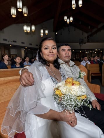 The bride and groom, Angelica Moyao and Vincente Marban are photographed after a community wedding held at St. Oliver Plunkett Church on the feast of Our Lady of Guadalupe. Photo by Johnathon Kelso