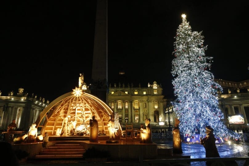 The group was scheduled to gather in St. Peter’s Square in the evening for the official unveiling of the Nativity scene and the lighting of the Christmas tree. But a major rainstorm with a forecast for more caused the Vatican to move the evening festivities indoors, although hundreds of people still were in the square for the lighting.