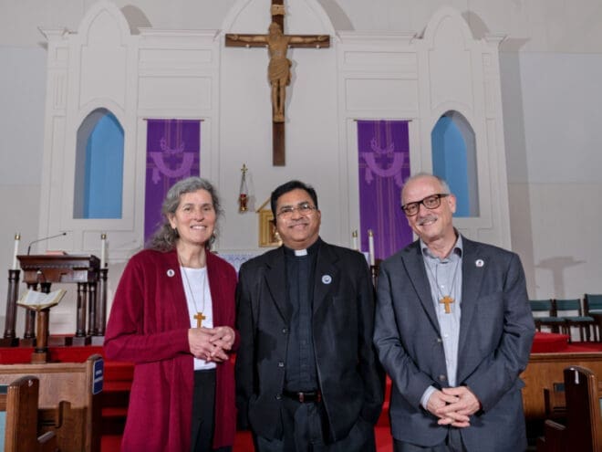 Father Tomy Puliyanampattayil Joseph, MSFS, the provincial superior of the Congregation of the Missionaries of St. Francis de Sales, center, and Fransalian Associates Diane Maguire, left, and Louis Zurzolo, right, are photographed in the sanctuary at St. Marguerite d’Youville Church. Photo by Johnathon Kelso