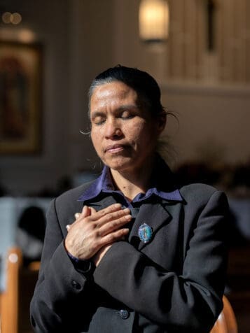 An usher prays before the Mass begins at Divine Mercy Mission. Photo by Johnathon Kelso