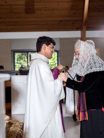 Father Peeter Pedroza receives a warm greeting from a parishioner after administering Communion at Divine Mercy Mission. Photo by Johnathon Kelso