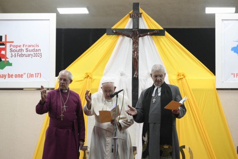 The pope said yes, of course, and told her, “that blessing will be very special, since I will be giving it together with my brothers Justin and Iain”–Anglican Archbishop Justin Welby of Canterbury and the Rev. Iain Greenshields, moderator of the Presbyterian Church of Scotland, who were making the ecumenical pilgrimage of peace with the pope to South Sudan.