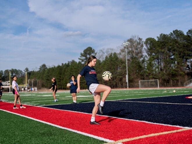St. Mary’s Academy soccer player Eva Launay-Fallasse practices skills at at the school’s new turf field in Fayetteville. She is a senior and co-captain of the team. Photo by Johnathon Kelso