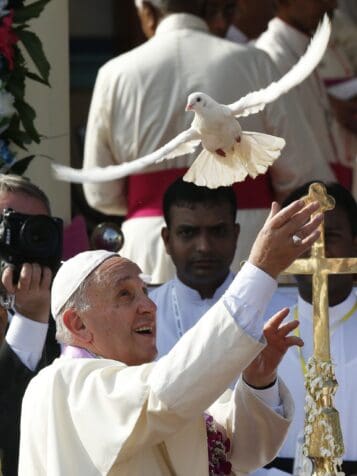 Pope Francis releases a dove at the Sanctuary of Our Lady of the Rosary in Madhu, Sri Lanka, Jan. 14, 2015. CNS photo/Paul Haring