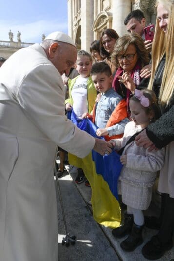 Pope Francis greets a group of children holding the Ukrainian flag after his general audience in St. Peter’s Square at the Vatican March 29. He was taken to the hospital following the audience after complaining of chest pain. CNS photo/Vatican Media