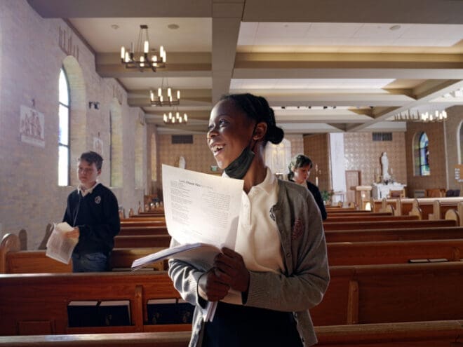 Sixth-grade student Madison Doyle passes out programs during the May crowning and Mother’s Day Mass held at St. Thomas More Church on May 3. Photo by Johnathon Kelso