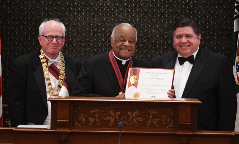 During the ceremony, Cardinal Gregory received the Lincoln Medallion from Ronald Spears, the chancellor of The Lincoln Academy of Illinois, and Illinois Gov. JB Pritzker presented him with a certificate recognizing Washington’s archbishop as a Lincoln Laureate.
