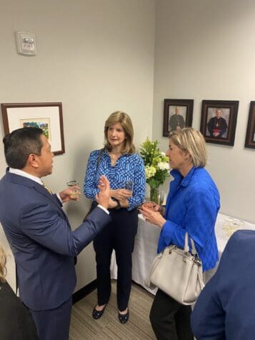 Deacon Rick Medina, chief advancement officer for the Archdiocese of Atlanta, visits with supporters of the Catholic Foundation of North Georgia at its office blessing and reception in March. The foundation is celebrating 30 years, and recently renovated and expanded its offices.