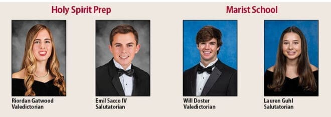 The valedictorian at Holy Spirit Prep is Riordan Gatwood, daughter of Jubal and Dorothy Gatwood. The family worships at Holy Spirit Church. Gatwood plans to attend Georgia Institute of Technology to study biochemistry.