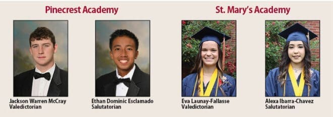 The valedictorian for Pinecrest is Jackson Warren McCray. He is the son of Jennifer and Edward McCray. He will be attending the United States Military Academy West Point and will study mechanical engineering.