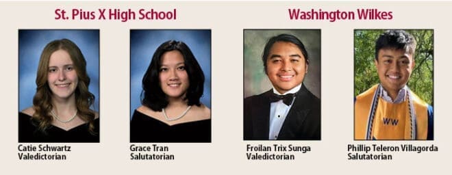 The valedictorian of St. Pius X is Catie Schwartz, daughter of Stephen and Ann Schwartz. They are members of Oak Grove Methodist Church. Schwartz will attend Emory University and major in biology.