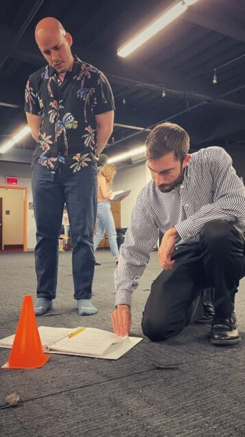 Joey Martineck, right, goes over stage instructions with Steven Corrales, who is portraying Adam, in “Garden.” Martineck wrote the musical and is directing its Atlanta premiere, which is based on the book of Genesis. Photo by Andrew Nelson