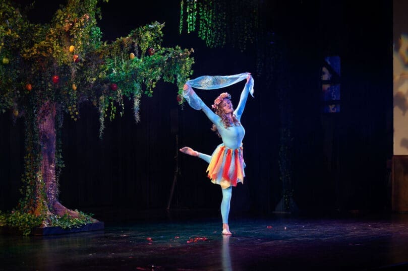 The stage’s most significant set piece establishes a sense of place: an expansive Tree of Knowledge of Good and Evil. Eve’s house of wood, tree stumps and leaves also decorate the stage. The piece is a two-and-a-half-hour show. In addition to a cast of about 15 actors, the musical director is Christian Magby, an actor and composer at Atlanta’s Alliance Theatre.