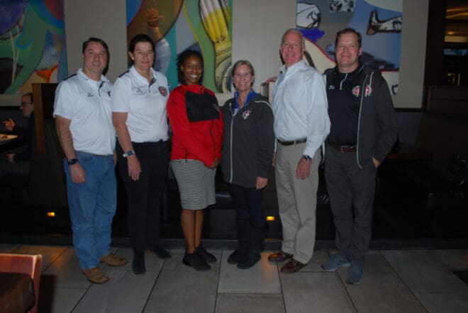 The leadership of Catholic Metro Sports includes, from left, Pete Smith, board chair; Trish Marmion, athletic director; Shanice McLeish, athletic director; Lisa West, treasurer Mike Mulkeen, communications, and Rob Aldrich, executive director.