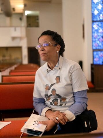 Joi Parks of KPCLA Court #313 of the Ladies Auxiliary of the Knights of Peter Claver sits in the sanctuary of Sts. Peter and Paul Church before the Sojourning On the Road to Sainthood event. Photo by Johnathon Kelso