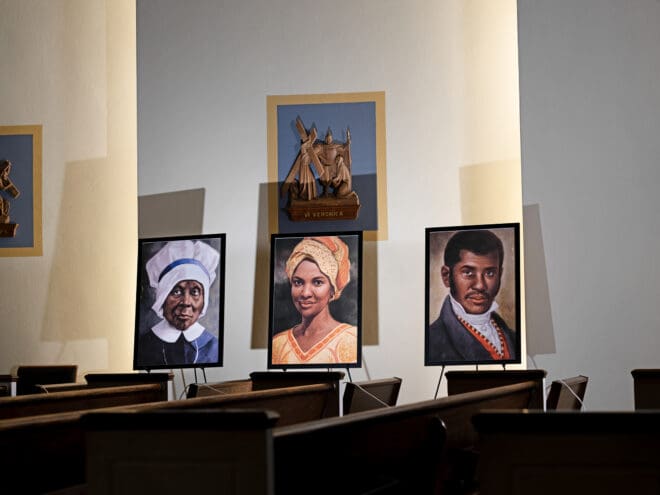 Portaits of the Black American candidates for sainthood are presented at the altar of Sts. Peter and Paul church before the Sojourning On the Road to Sainthood event. Photo by Johnathon Kelso