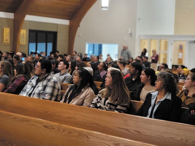 Parishioners and guests listen intently to Cardinal Christophe Pierre’s remarks the evening of Feb. 19 at Brookhaven’s Divine Mercy Mission. Photo Courtesy of Radio Inmaculada