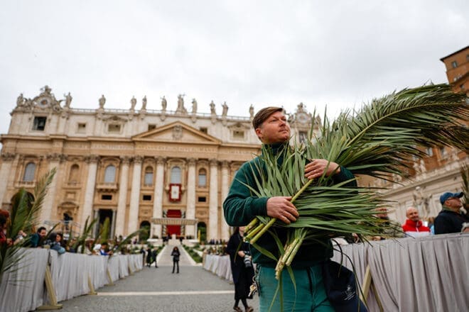 A man carries palm fronds to distribute to people taking part in Palm Sunday Mass in St. Peter’s Square at the Vatican March 24, marking the beginning of Holy Week. CNS photo/Lola Gomez