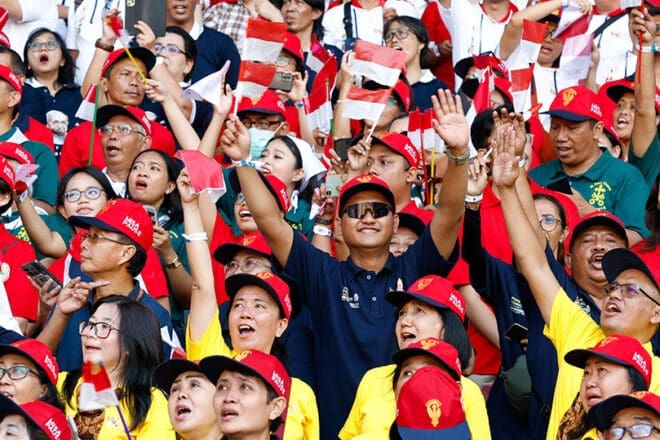 People cheer as Pope Francis arrives at the Gelora Bung Karno Stadium in Jakarta, Indonesia, to celebrate Mass Sept. 5. CNS photo/Lola Gomez