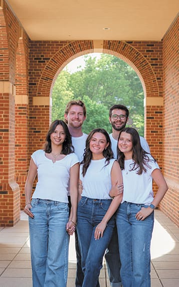 The UGA students who created Classic City Catholic are, front row from left, Melania Pacheco, Eleyna Gonzalez and Leigh Blanchard, and back from left, Ryan Jenks and Elijah Baker. UGA Catholic Center’s Father Brian McNavish first sparked the idea behind the apparel company. Photo by Marissa Muenchen