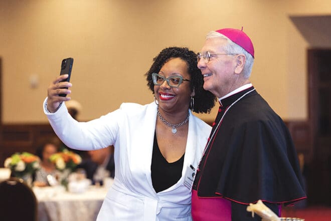 Archbishop Gregory J. Hartmayer, OFM Conv., shares a light moment with Catholic Foundation donor LaRhonda Julien following the annual Mass that honors members of the foundation’s Deo Gratias and Founders Societies Photo by Allison Shirreffs